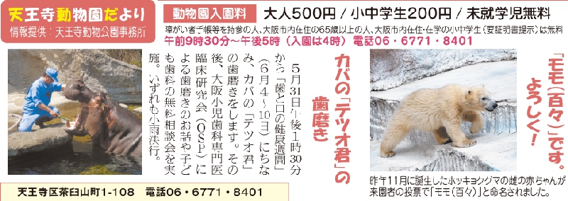 同日午後1時30分からは「歯と口の健康週間」(4~10日)にちなみ、カバの「テツオ君」の歯磨きをします。その後、大阪小児歯科専門医臨床研究会(OSP)による歯磨きのお話や子ども歯科の無料相談会も実施します。いずれも小雨決行。