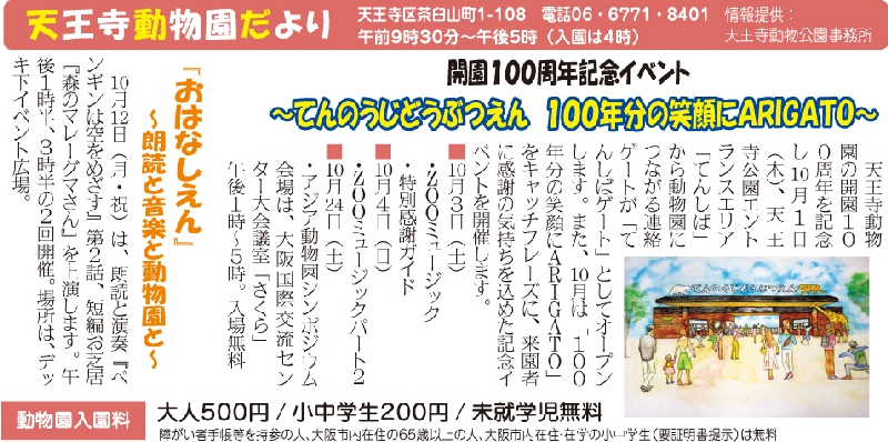 動物園入園料 : 大人500円 小・中学生200円 大阪市在住の小中学生(在学を含む)、大阪市在住の65歳以上、障がい者手帳を持参の人は無料。