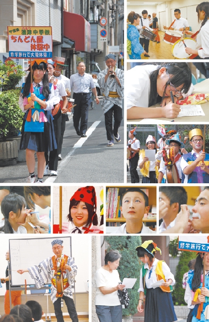 6月6日、初夏の強い日差しの下、千葉県市原市立湿津(うるつ)中の3年生(約40人)が修学旅行で大阪にやって来た。体験学習の一環で、お好み焼き、チャンバラ、ちんどん屋といった「大阪」を学ぶのが目的だ。上町台地のちんどん屋「ちんどん通信社」(中央区)の協力の下、空堀商店街を舞台に「ちんどん体験」(2時間)が行われた。