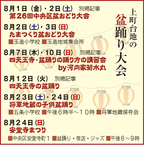 和宗総本山四天王寺で8月12日(水)、11年ぶりに「盆踊り大会」が開催されるのに先立ち、8月7日(木)・10日(日)に「盆踊りの踊り方の講習会」が開かれます。時間は両日とも午後4時~5時半。