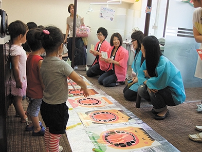 プログラムは、「聖徳太子絵伝の絵解き」(四天王寺)、「本物に触れよう! 映画館の映写体験」(あべのアポロシネマ)、「体を使って楽しくコミュニケーション体験!」【写真】(大阪社会体育専門学校)など。あべのHoop1階オープンエアプラザのステージでは「フラッシュ暗算」(23日)やサイエンスショー(23日・24日)なども行われます。