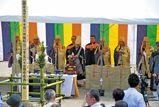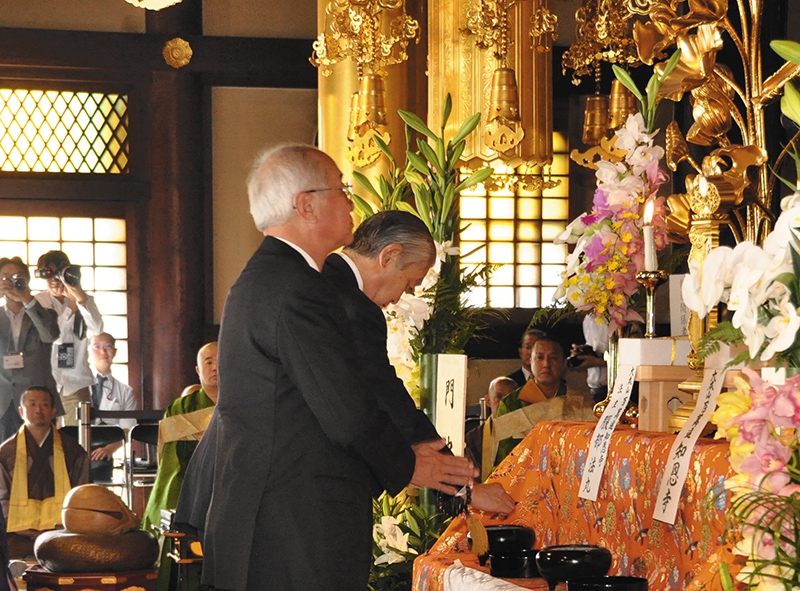 供養法会の様子 10月1日、一心寺で「大坂之陣四百年供養法会」が営まれ、大坂の陣で戦死した豊臣・徳川両軍戦死者の供養と平和を祈願しました。