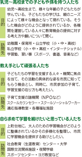 「うえまち教室」では、ターゲットを3つに分け(左記)、国や教育委員会などの全体的な方針、現場の独自性、生まれている課題などを実際の現場を訪れて取材。読者の皆さんが上町台地の住民として「教育の参加者」となれるような有益な情報を提供したいと考えています。