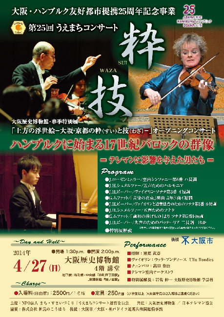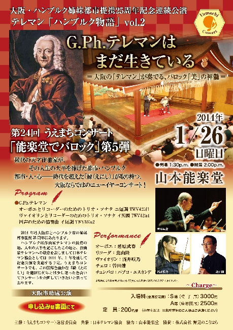 ハンブルクは作曲家テレマンの終焉の地。人生の大半を過ごした地と、作曲家テレマンへの敬意を表し、日本テレマン協会は2014年、1年を通して記念公演を実施する予定。この国際色豊かな「縁(えにし)」を題材に例年とは少し違った色合いでうえまちコンサートを企画していきたいと思っております。