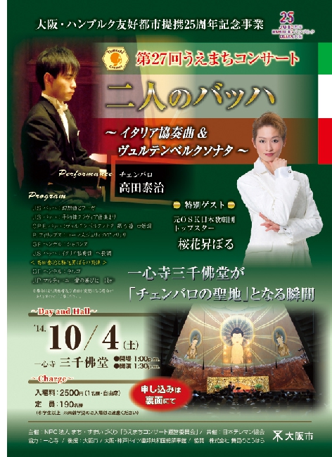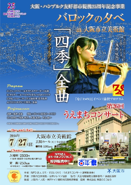 今回は上方講談師の旭堂南左衛門が出演。チェンバロは高田泰治(日本テレマン協会)。特別ゲストに同協会音楽監督の延原武春さんと、来日中の世界的バイオリニスト、ウッラ・ブンディースさんを迎えます。これまでにない新たな試みの「うえまちコンサート」にどうぞご期待ください。
